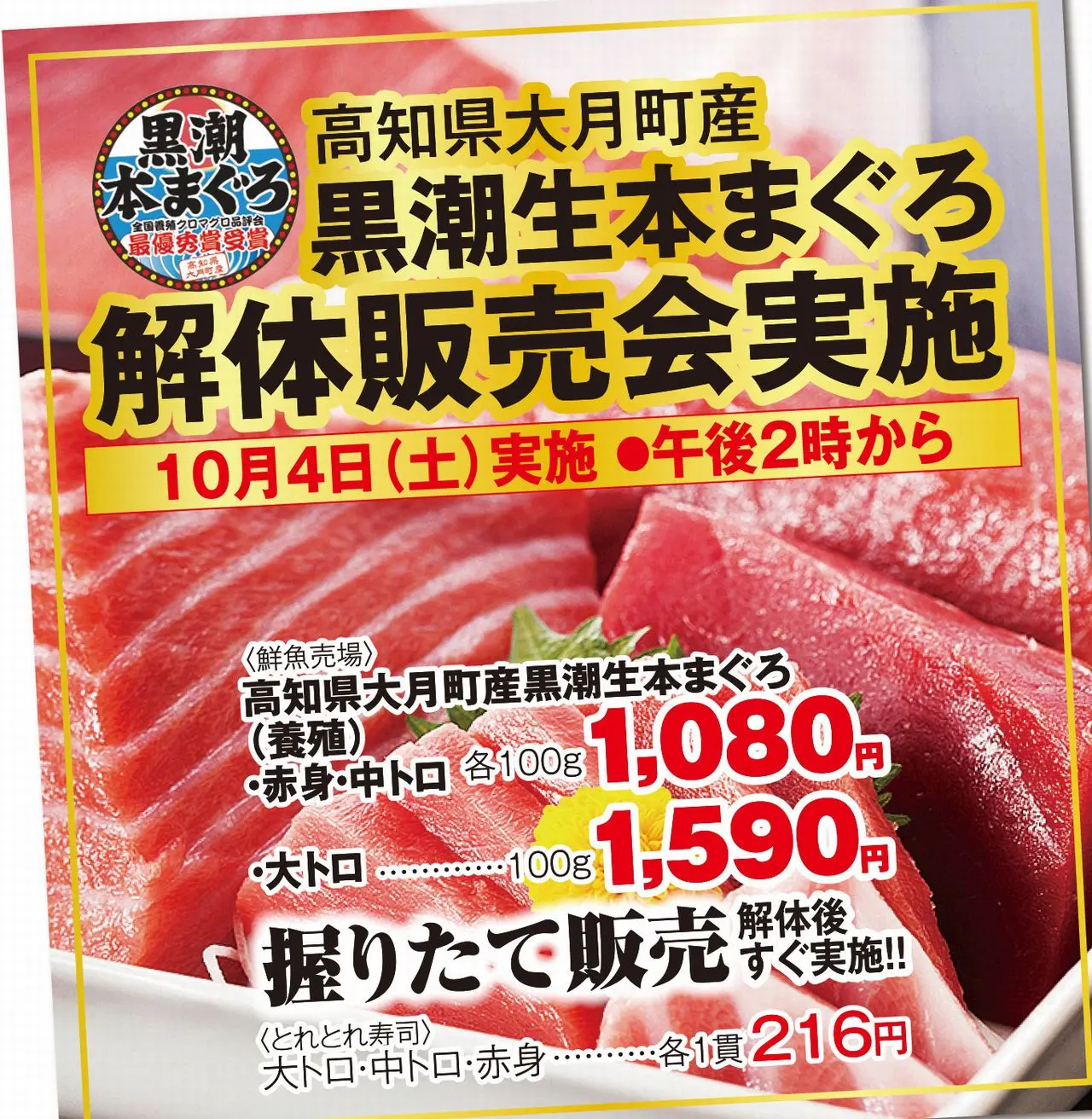 黒潮本マグロの解体販売の楽しい企画や15周年特別にぎり寿司盛合せなどもあるようです。
