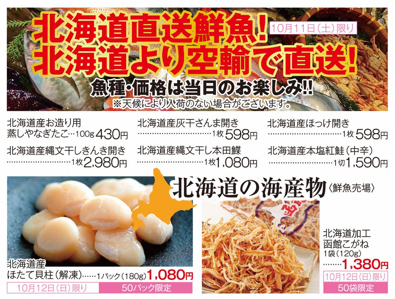「秋の北海道フェア」では、北海道の鮮魚を空輸にて直送し販売されるようです。