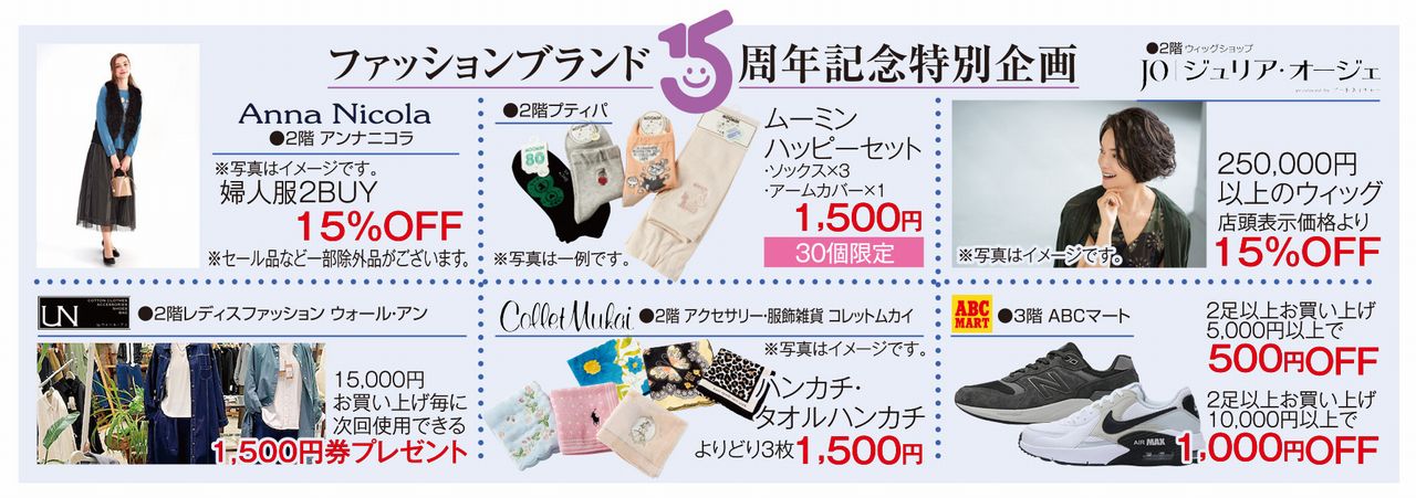 また、ファッションブランドでは15周年に合わせ、税込1,500円や15%OFFなどの企画も実施されます。