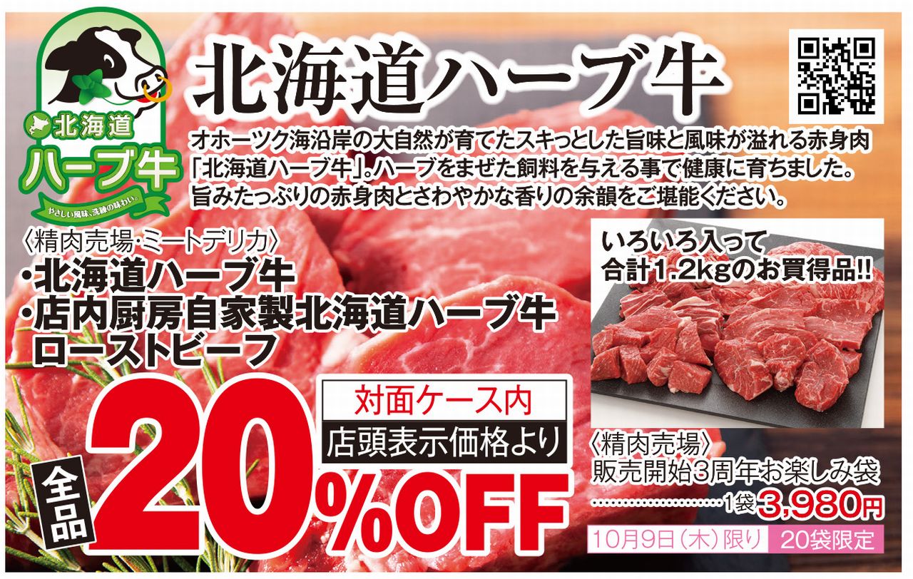 北海道ハーブ牛の20%OFFなどの目玉商品もあるようです。