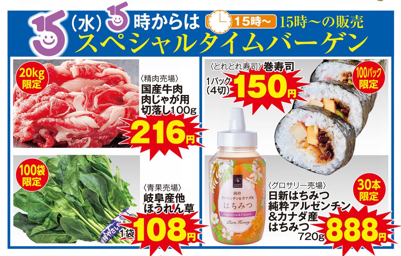 15周年の10月15日(水)15時からは精肉や鮮魚や青果や日用品などのスペシャルタイムバーゲンも実施されるようです。