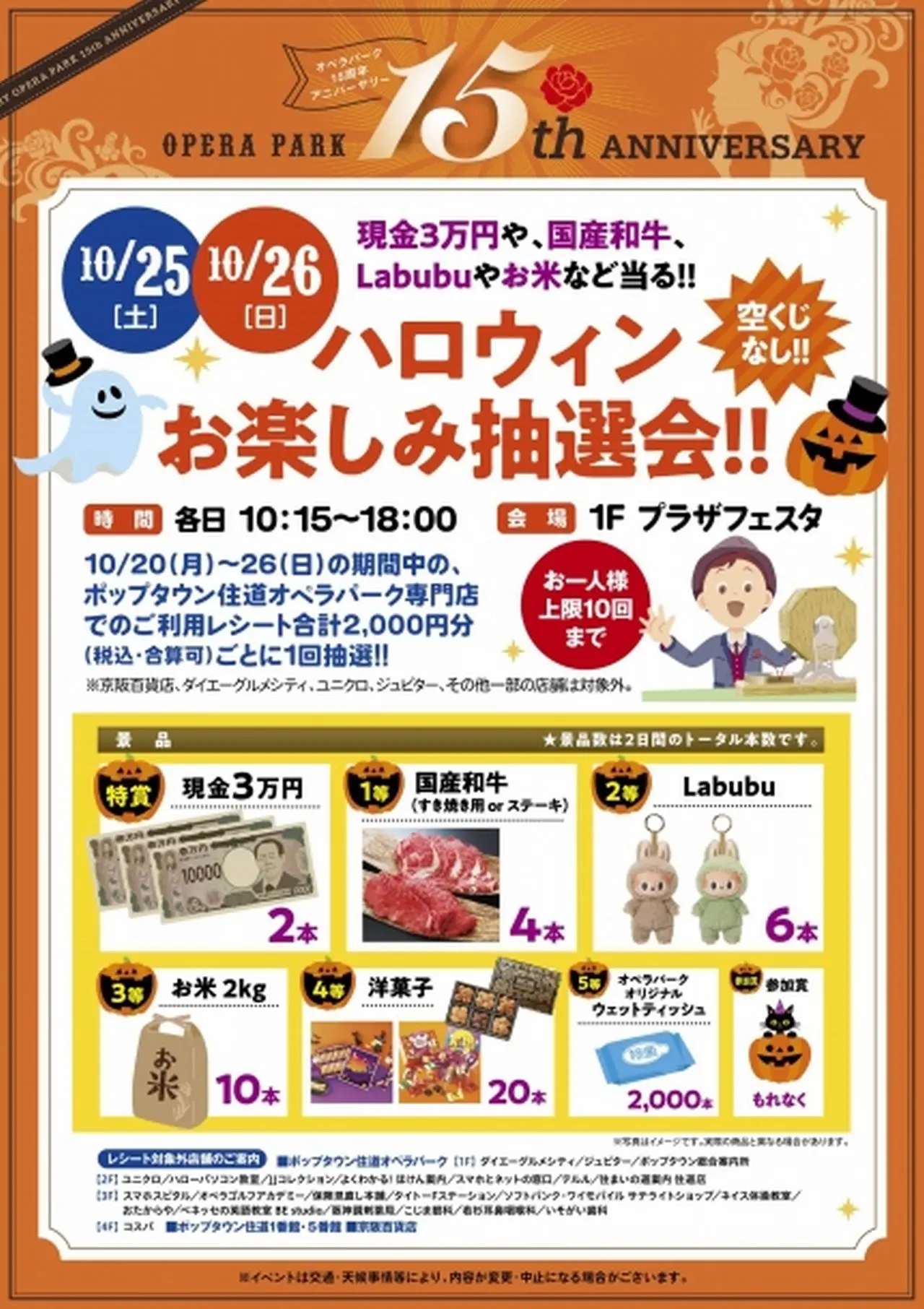 【大東市】15周年を迎るポップタウン住道オペラパークで現金3万円やお米や国産和牛が当たる大抽選会が実施されます!!