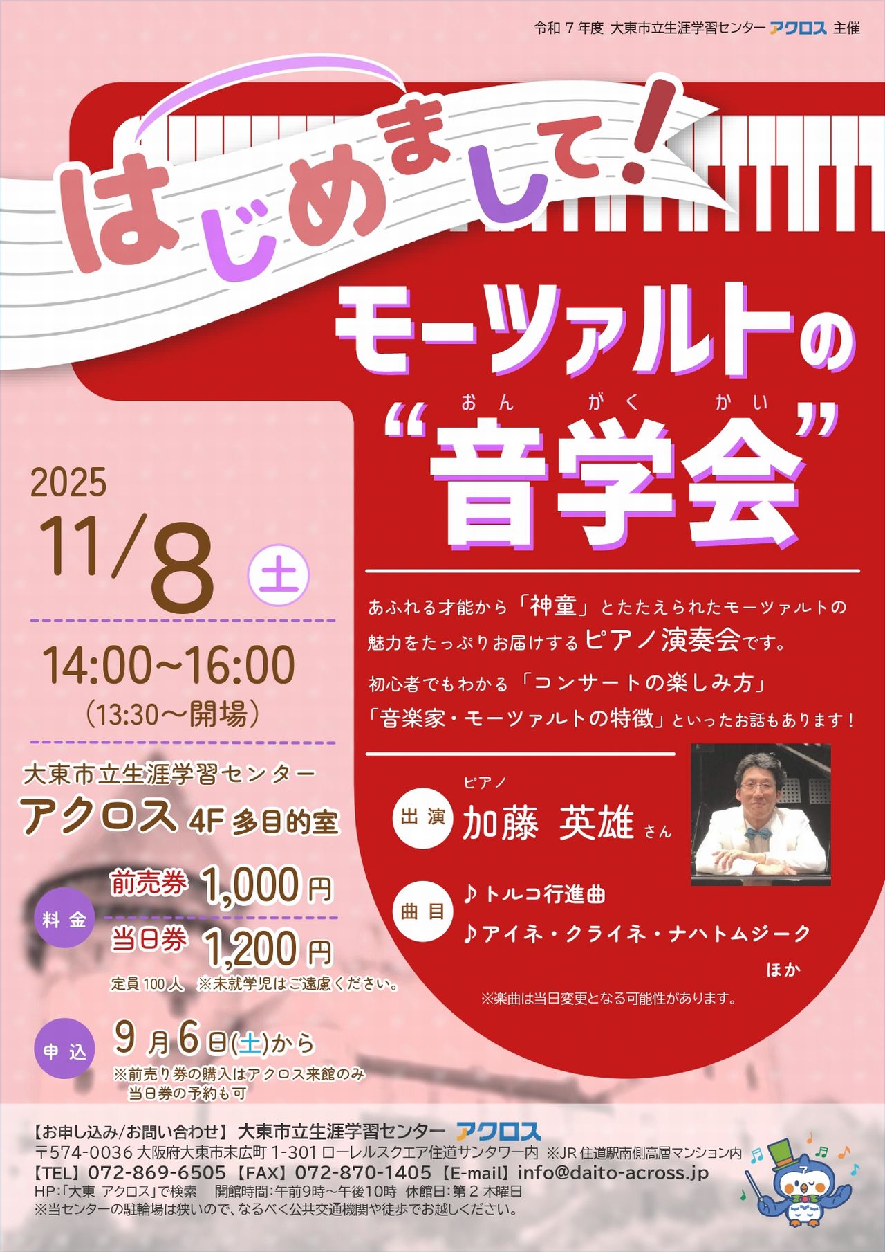 【大東市】モーツァルトの魅力がたっぷり詰まったピアノ演奏会!初心者でも安心の「モーツァルトの音楽会」を開催!