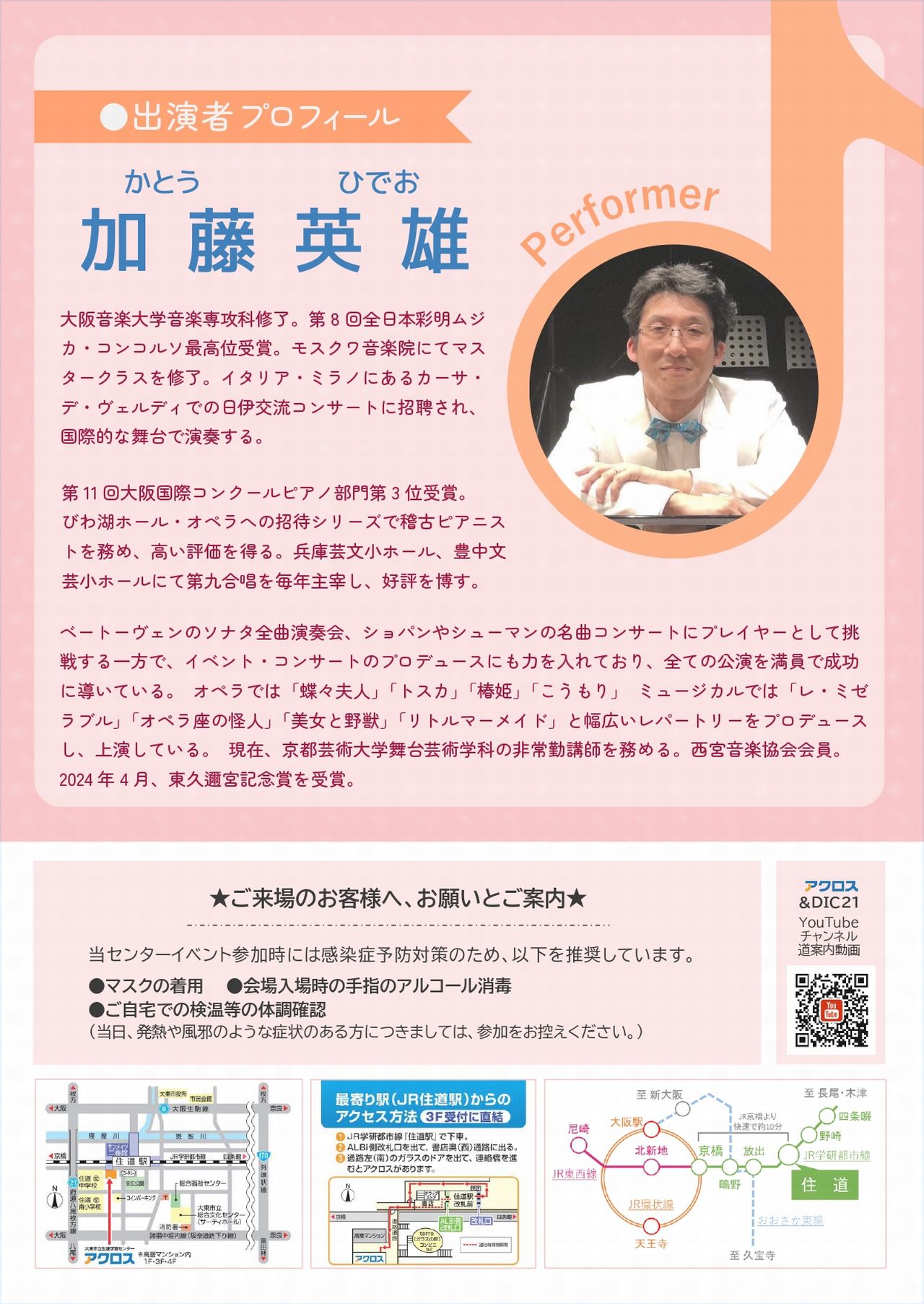 出演はピアノ演奏・加藤英雄さんで、演奏曲目は「トルコ行進曲」や「アイネ クライネ ナハトムジーク」などが予定されています。※楽曲は当日変更となる可能性もございます。
