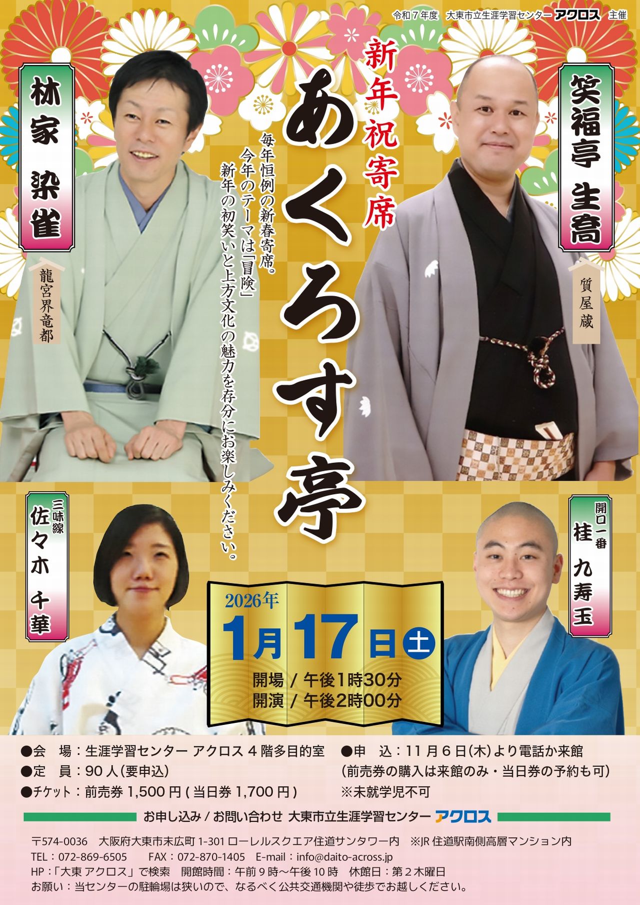 【大東市】恒例!新春の初笑い!大人気の「新年祝寄席 あくろす亭」の申し込み開始となりました。ご希望の方はお早めにお申し込みを!!