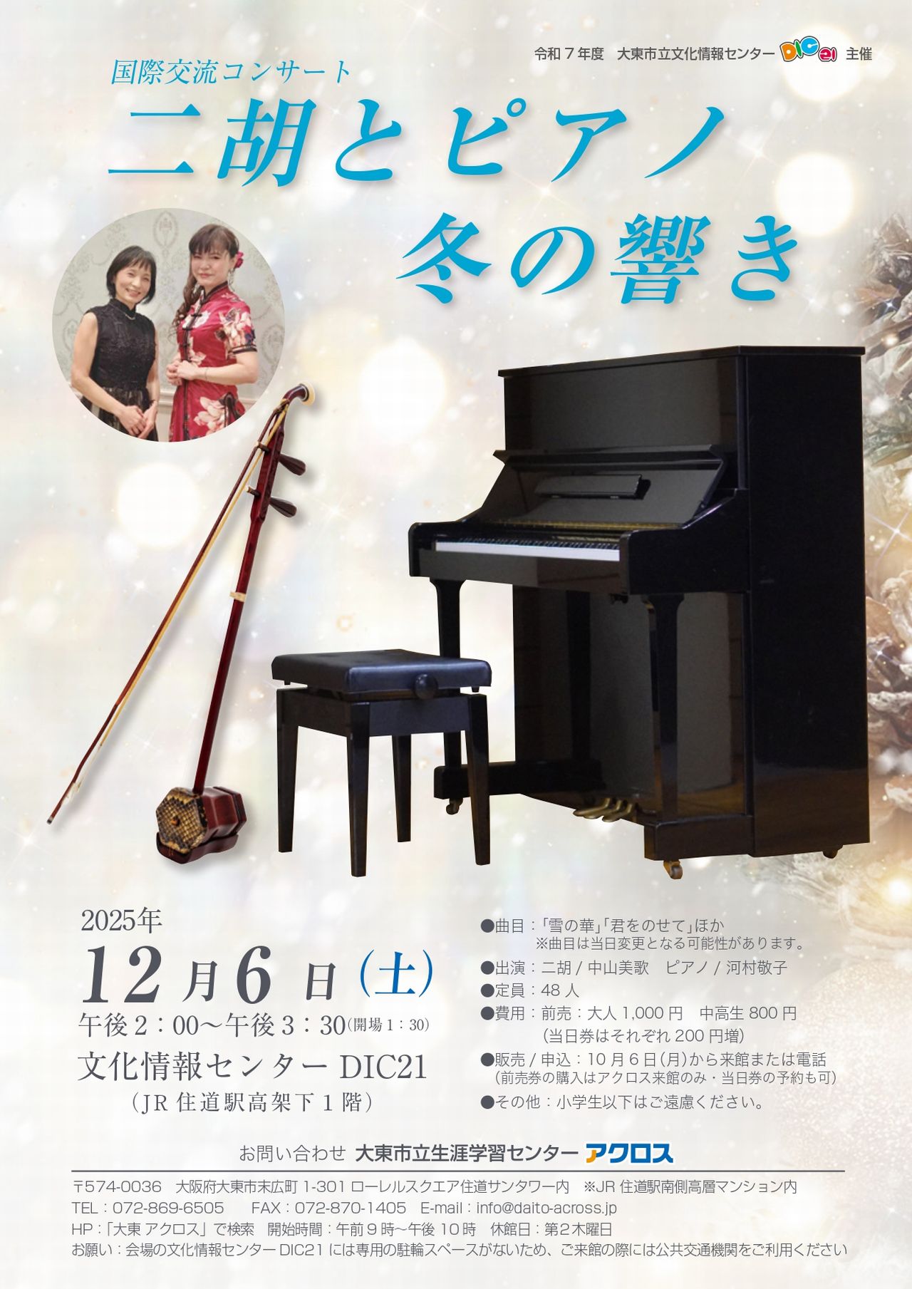 今回、大東市立文化情報センターDIC21にて開催されるイベント「国際交流コンサート 二胡とピアノ 冬の響き」の開催日は、2025年12月6日(土)となります。