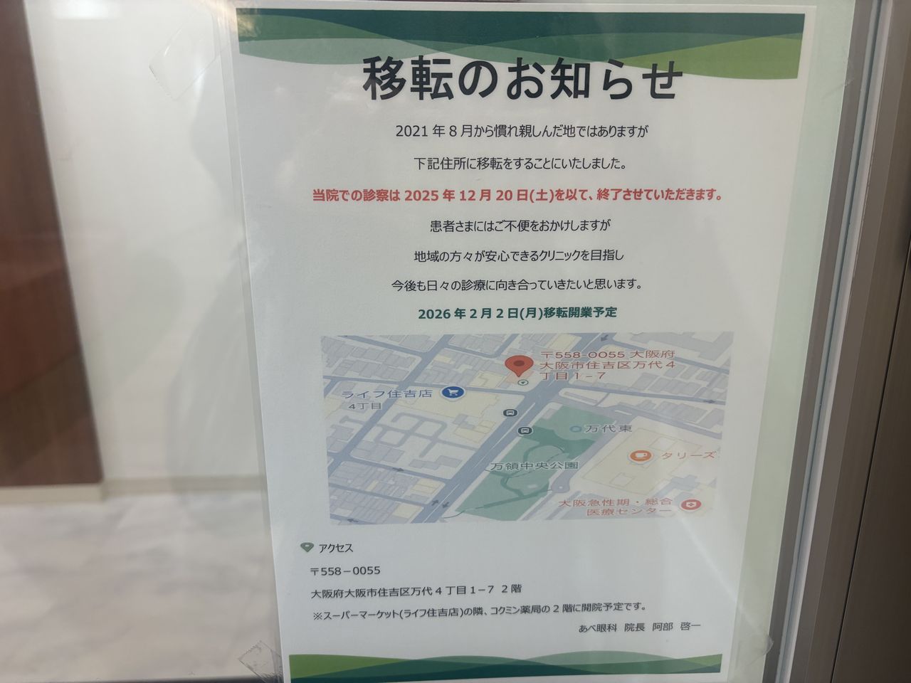 【大東市】南津の辺メディカルモール内のあべ眼科が閉院?との情報提供…どうやら移転のようです。