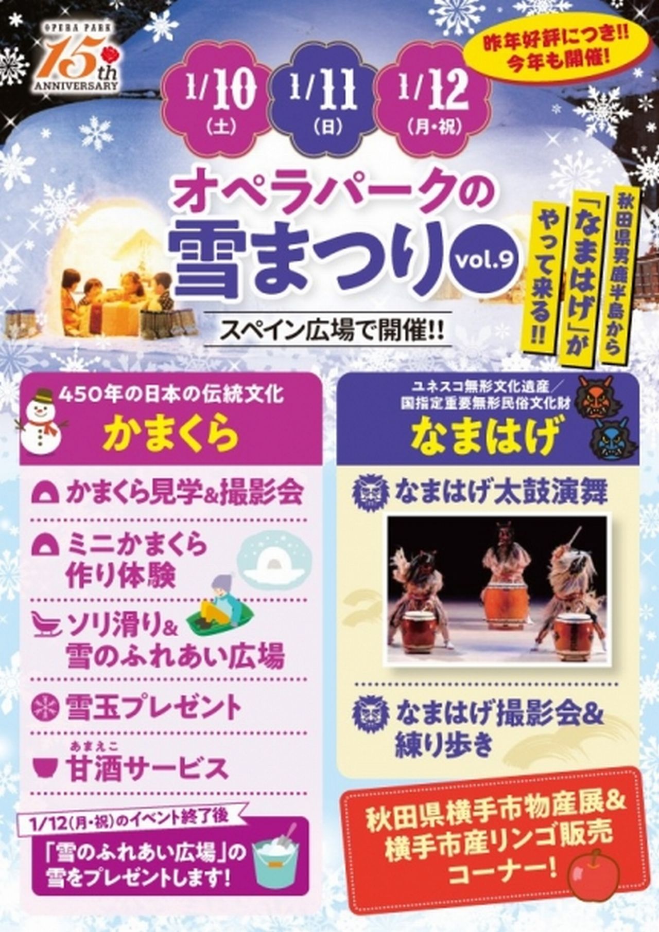 毎年、子ども達は雪遊びを楽しみなまはげに警戒して見ているだけでも楽しめます。また、大人は秋田県の物産展やリンゴのお買い物を楽しんでおられます。