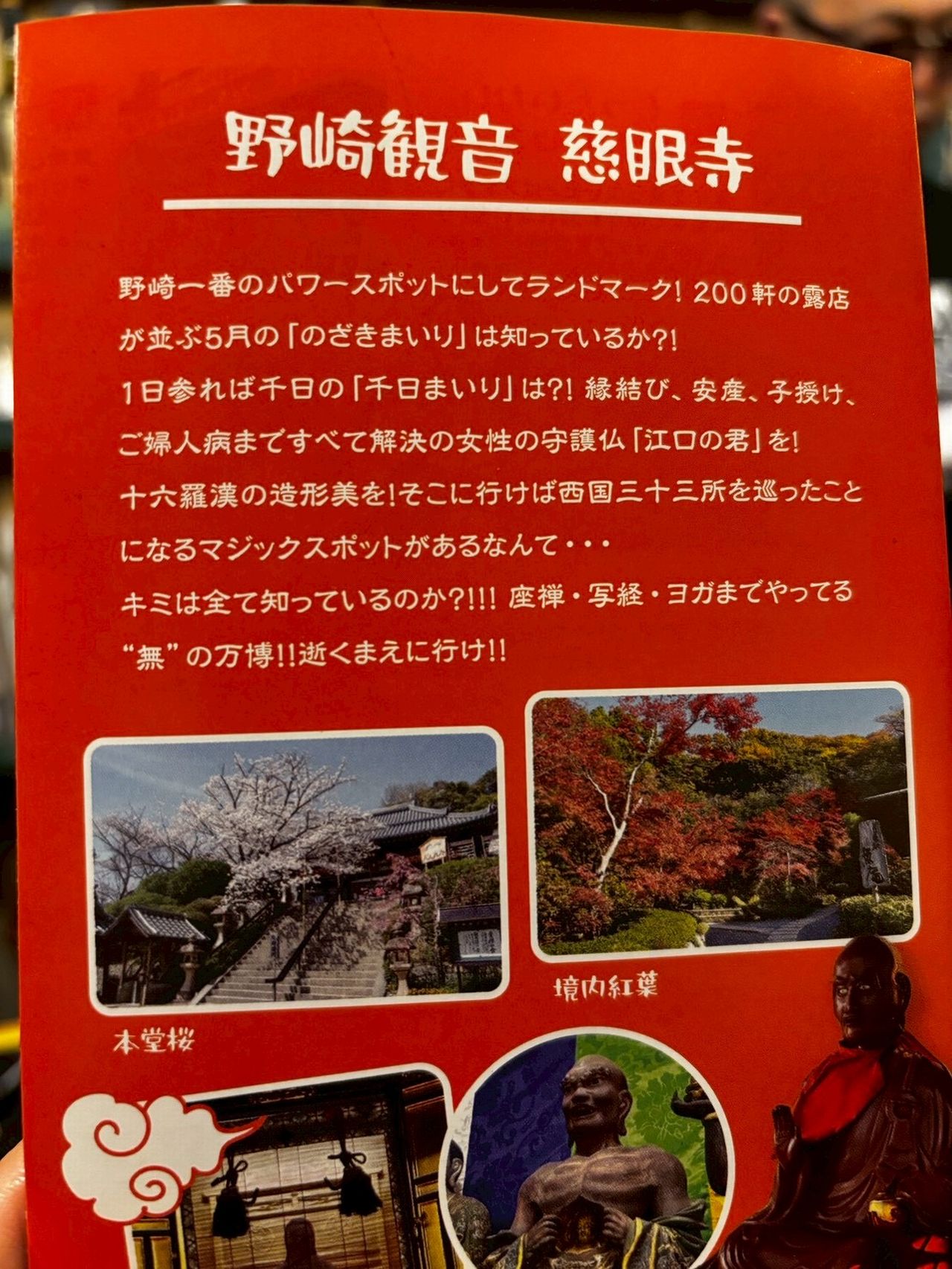 野崎の料理旅館「福寿山魚捨」や野崎を代表する野崎観音慈眼寺も、もちろんコメント付きで掲載されています。