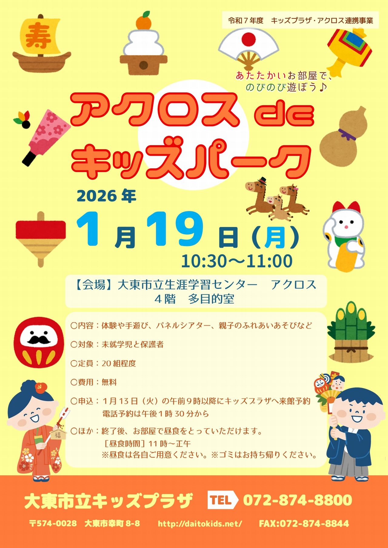 2026年最初の「アクロスdeキッズパーク」が2026年1月19日(月)に開催されます。