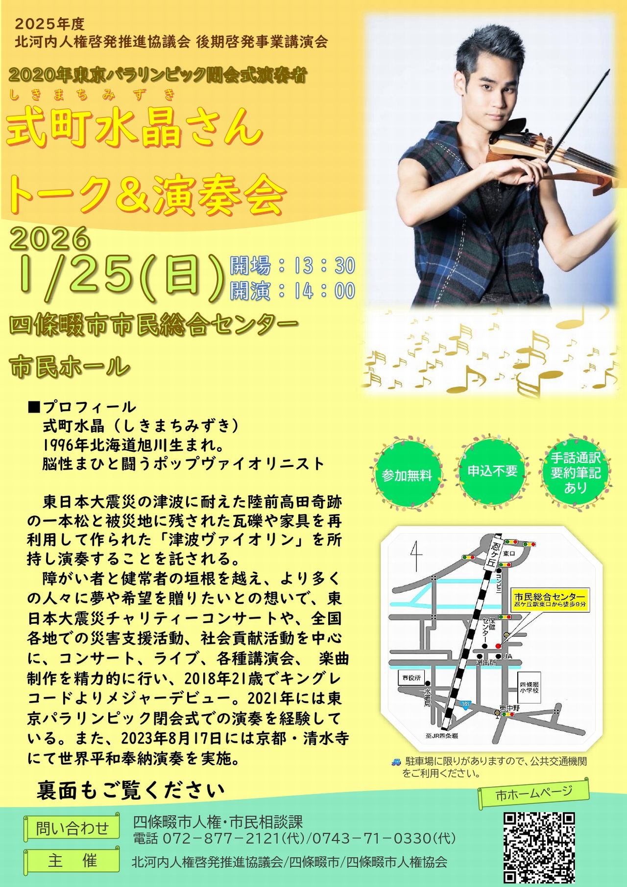 北河内人権啓発推進協議会講演会として脳性まひと闘うポップヴァイオリニストの式町水晶さんによるトーク&演奏会を開催します。