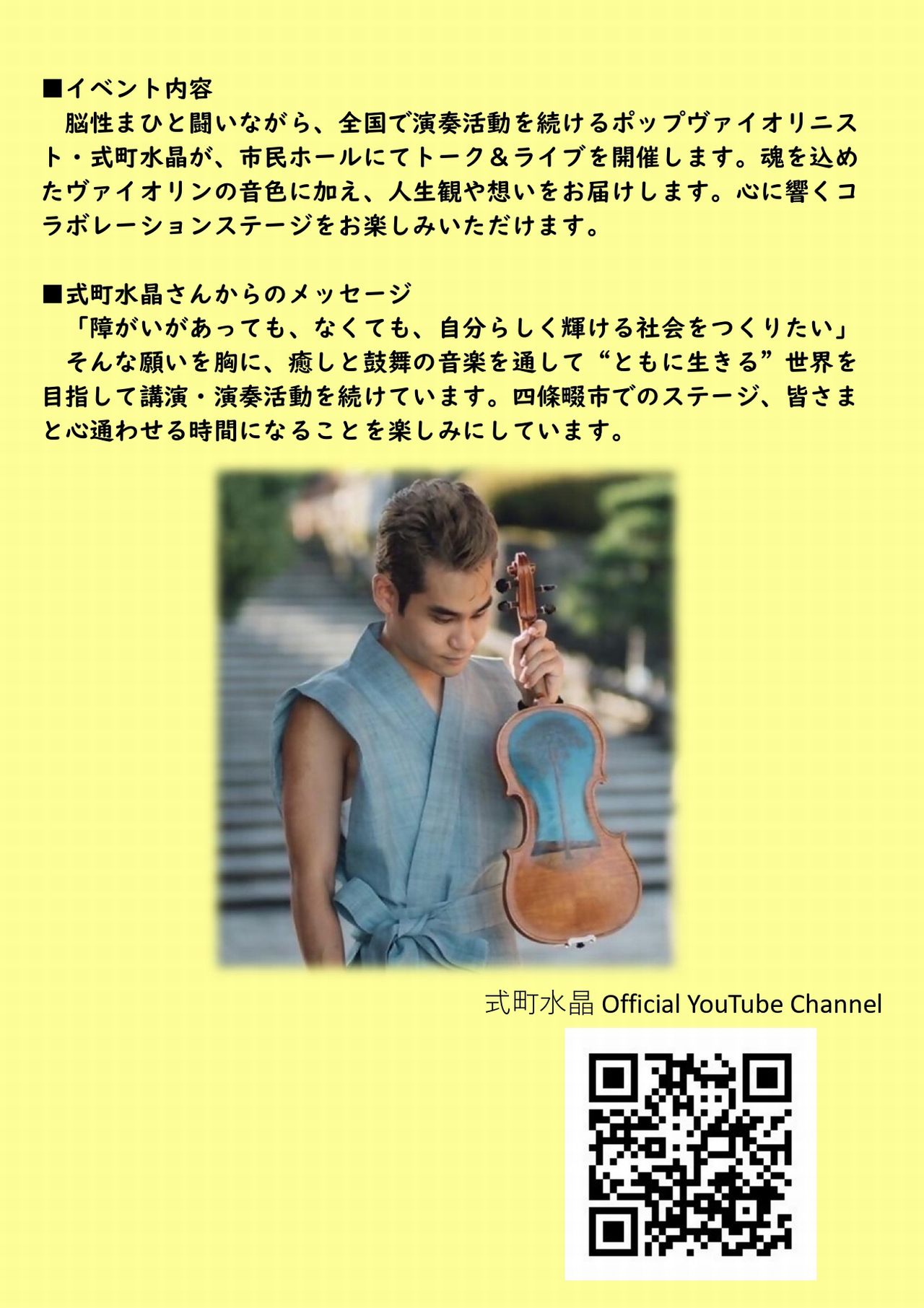 脳性まひと闘うポップヴァイオリニストの式町水晶さんによるトーク&演奏会の情報提供を頂きましたのでご紹介させて頂きます。