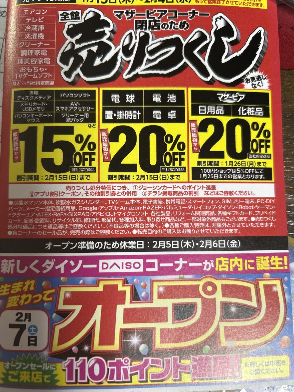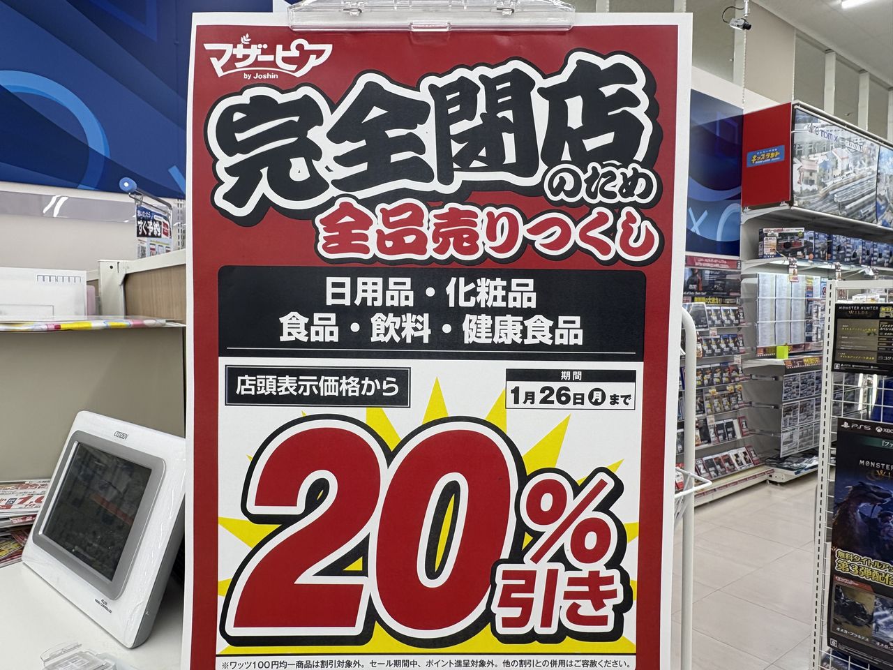 【大東市】ジョーシン大東店内のマザーピアコーナーが閉店するようです。現在売り尽くしセール中です。閉店後は…