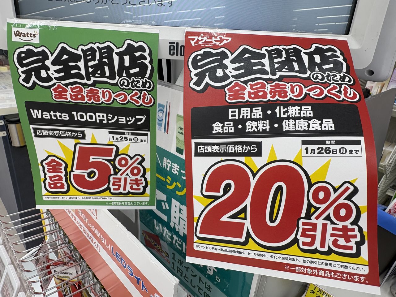 100円ショップのWattsも「完全閉店のため全品売り尽くし」とのことです。