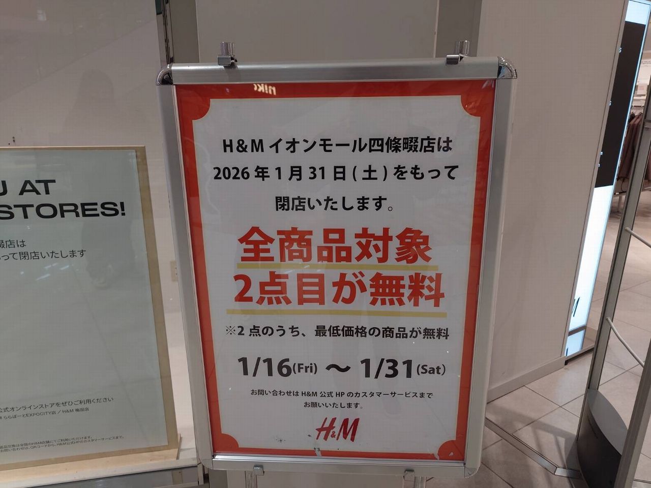 【四條畷市】えっ?あのお店が閉店?イオンモール四條畷1階の大型店舗が閉店。閉店に伴い2点目が無料のセール中です。
