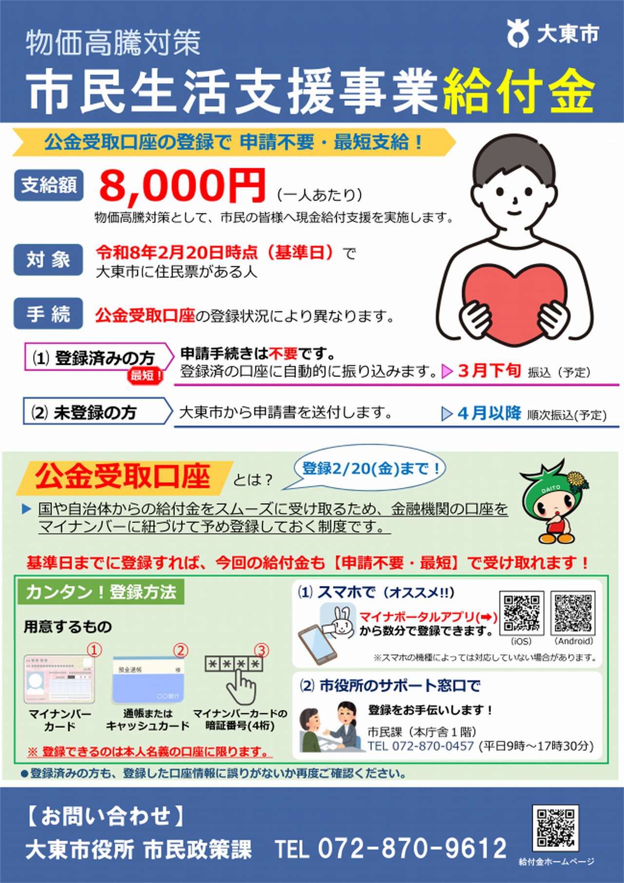 対象者は2026年2月20日時点で大東市の住民基本台帳に記録されている方が対象となります。