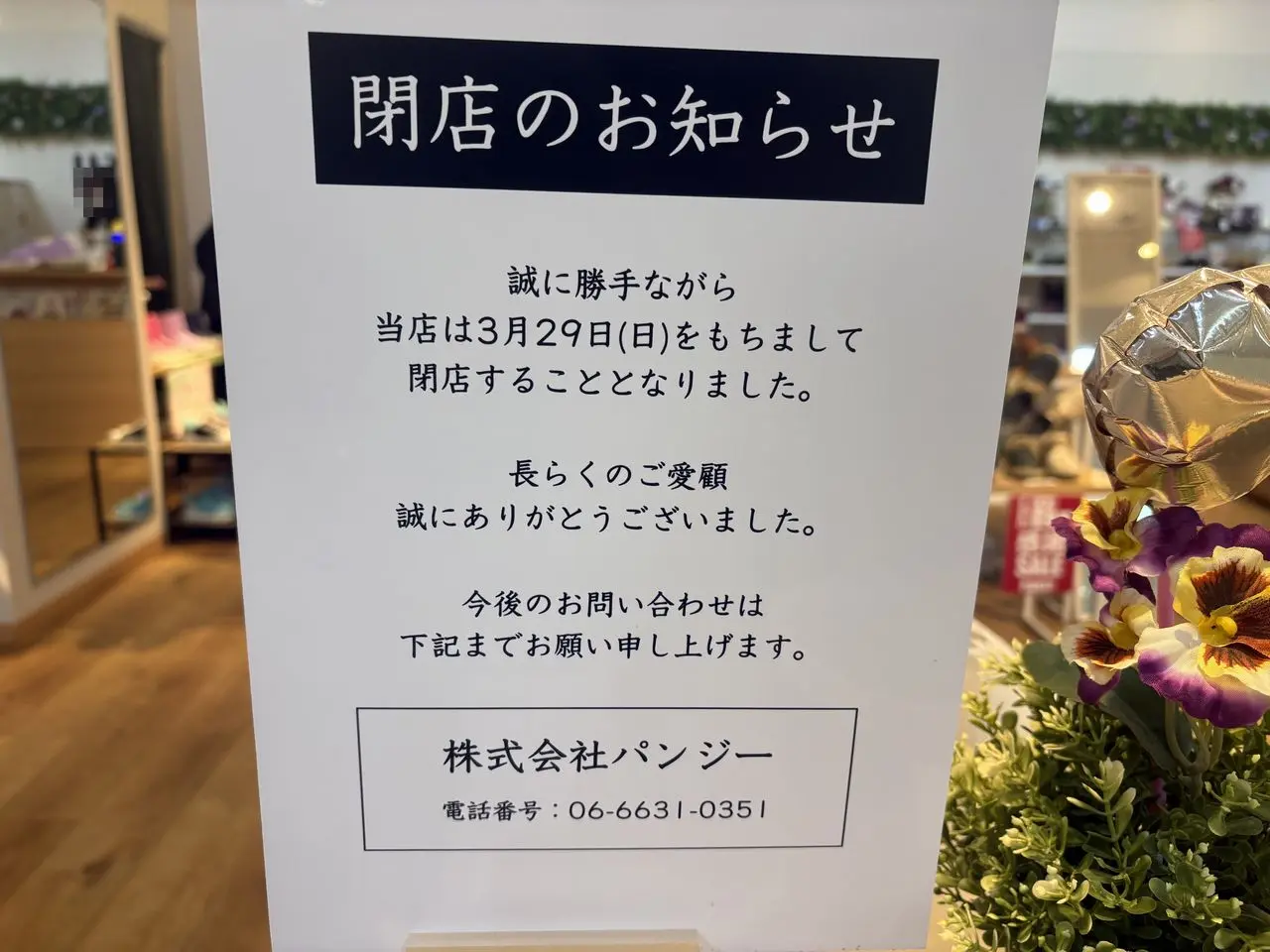 【大東市】ポップタウン住道オペラパーク1階の靴屋さん「Pansy (パンジー)」が閉店するようです。