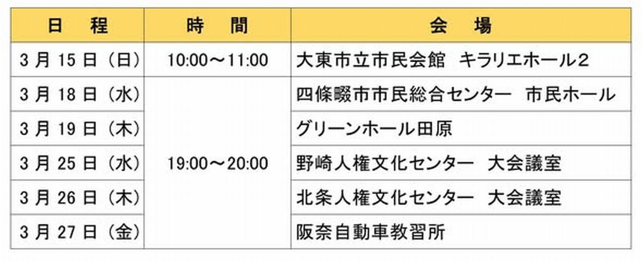 ※野崎人権文化センター・北条人権文化センター及び阪奈自動車教習所へは、自動車での来場はご遠慮ください。