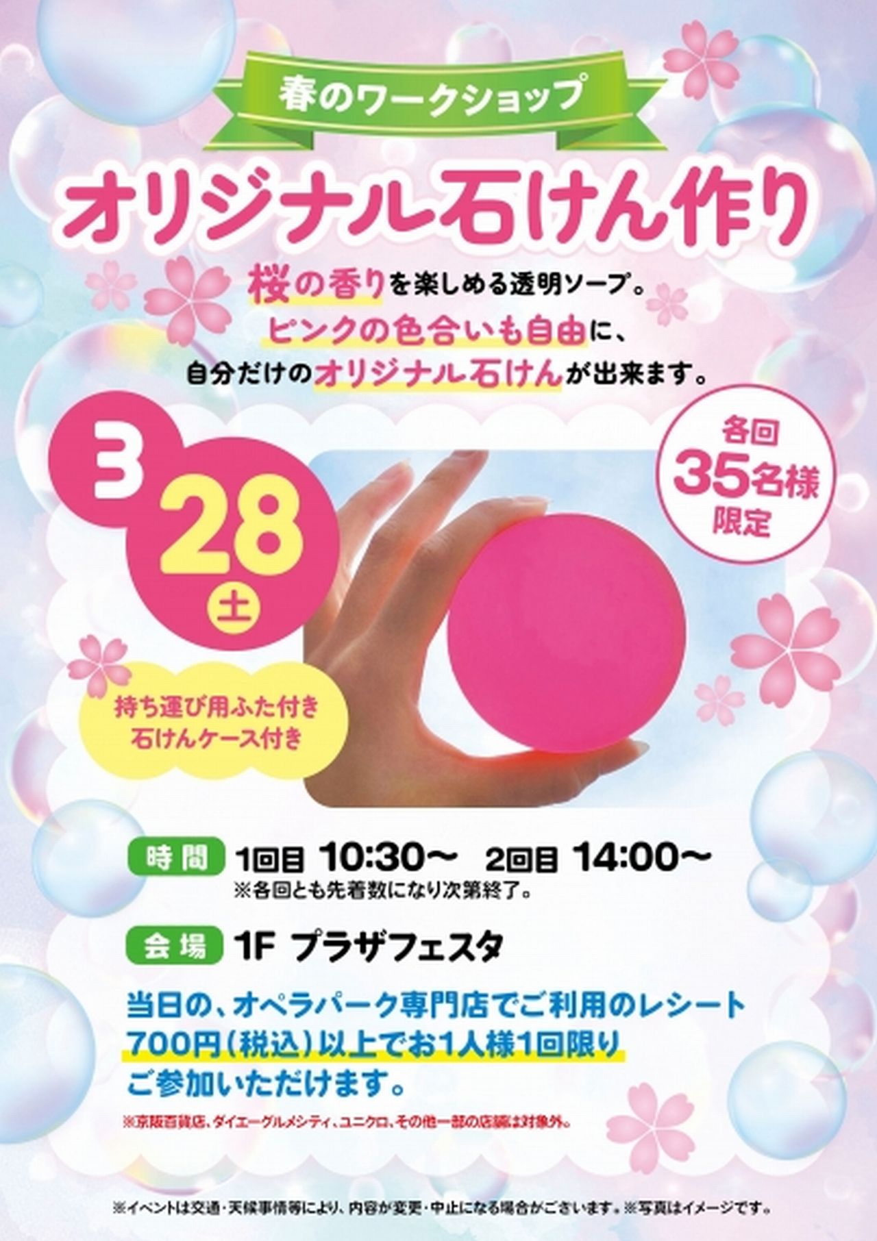 ポップタウン住道オペラパークで開催されるこの時期限定の「春のワークショップ」では、桜の香りを楽しめる「オリジナル石けん作り」が開催されます。