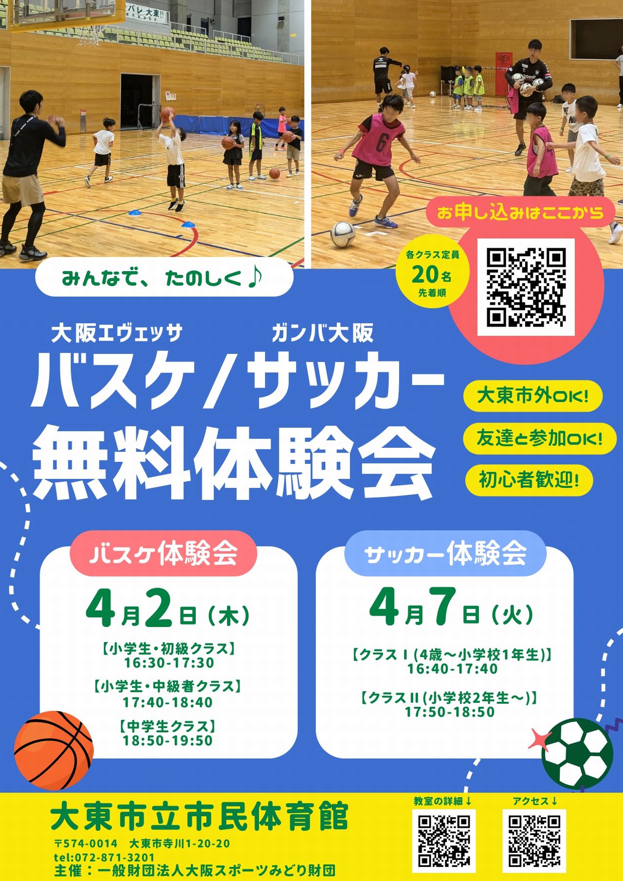 大東市立市民体育館では<バスケット無料体験会>を4/2(木)、<サッカー無料体験会>を4/7(火)に開催します。