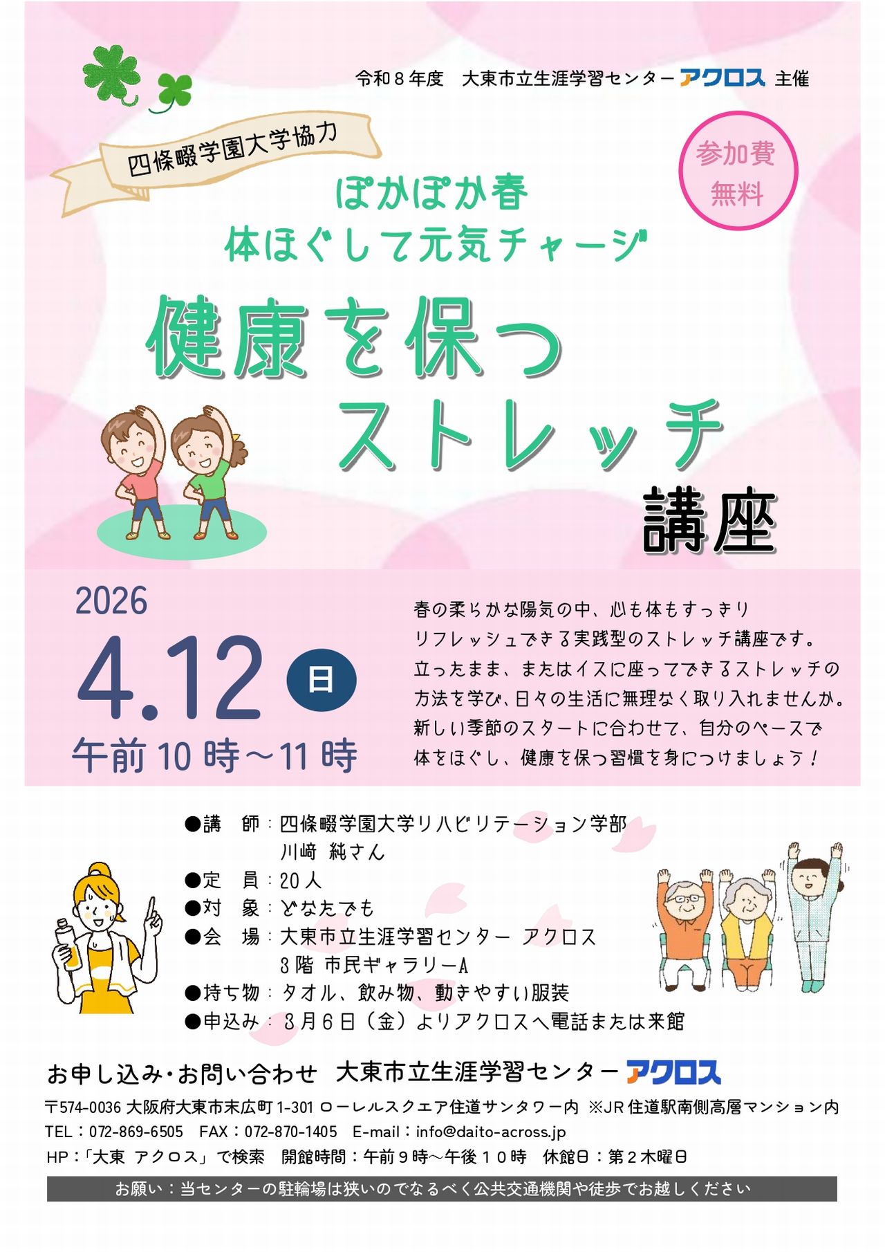 大東市立生涯学習センター アクロスにて四條畷学園大学の協力で、体ほぐして元気チャージ「健康を保つストレッチ講座」が開催されます。
