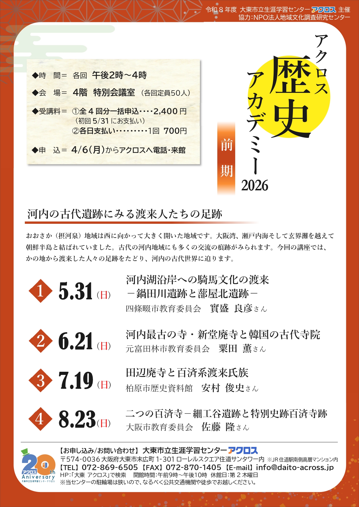 【大東市】2026年前期はどんなテーマ?歴史好きには欠かせない!!アクロス歴史アカデミー2026(前期)のご案内です。