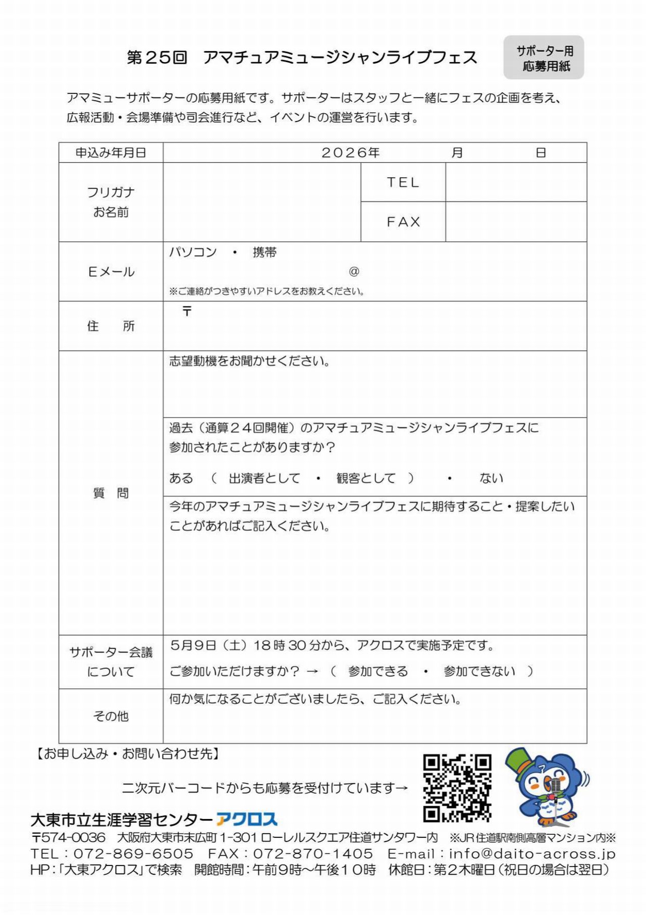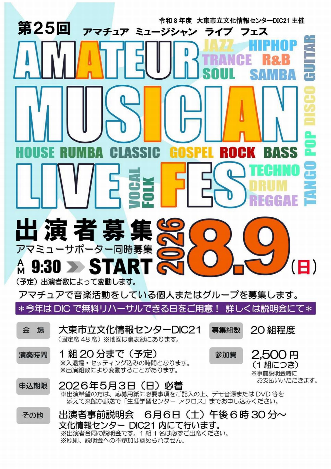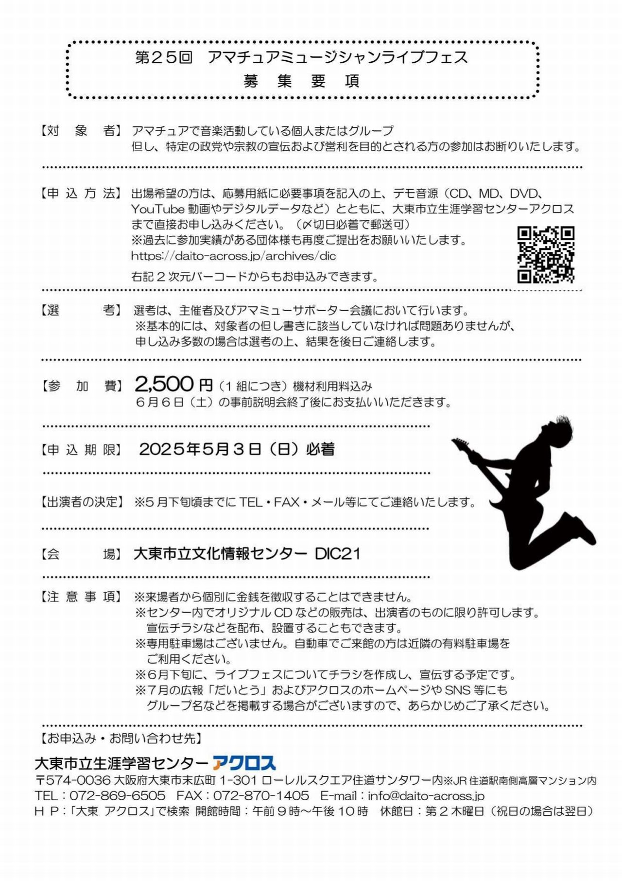 申込締切は2026年5月3日(日)必着です。出演希望の方は、応募用紙に必要事項を記入し、デモ音源等を添えて、大東市立生涯学習センターアクロスにてお申込みください。(持参でも郵送でもOKです。)