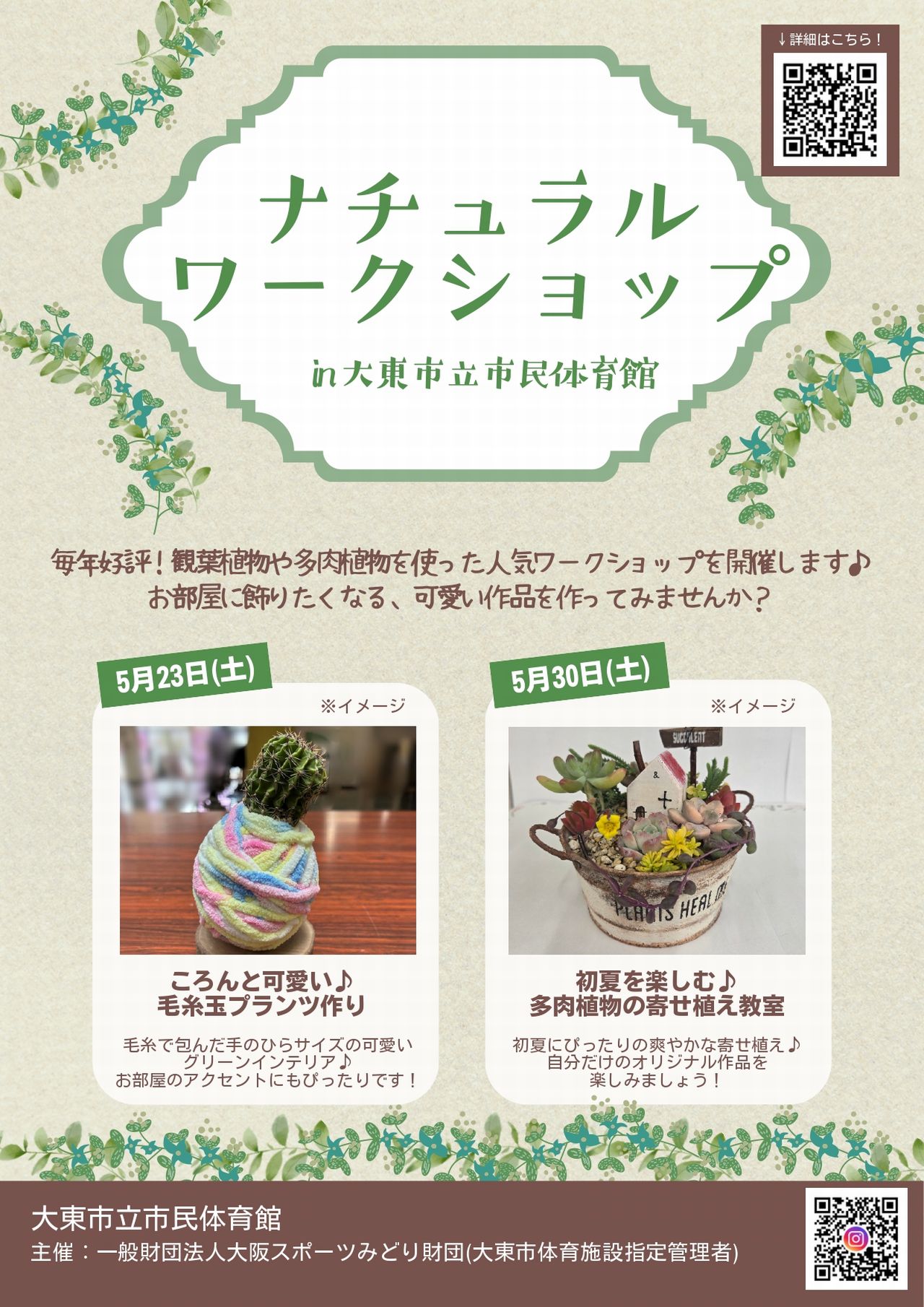 大東市立市民体育館では毎年好評いただいております観葉植物や多肉植物を使った人気ワークショップを5/23と5/30の2日間開催します。