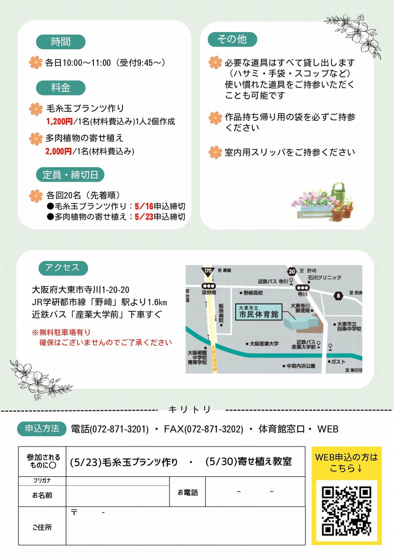 ・参加申込書(チラシ下部) ※申込フォームからお申込みの際は、備考欄に参加希望のワークショップ名をご記入ください。 (入力例:毛糸玉プランツづくり/多肉植物の寄せ植え教室)