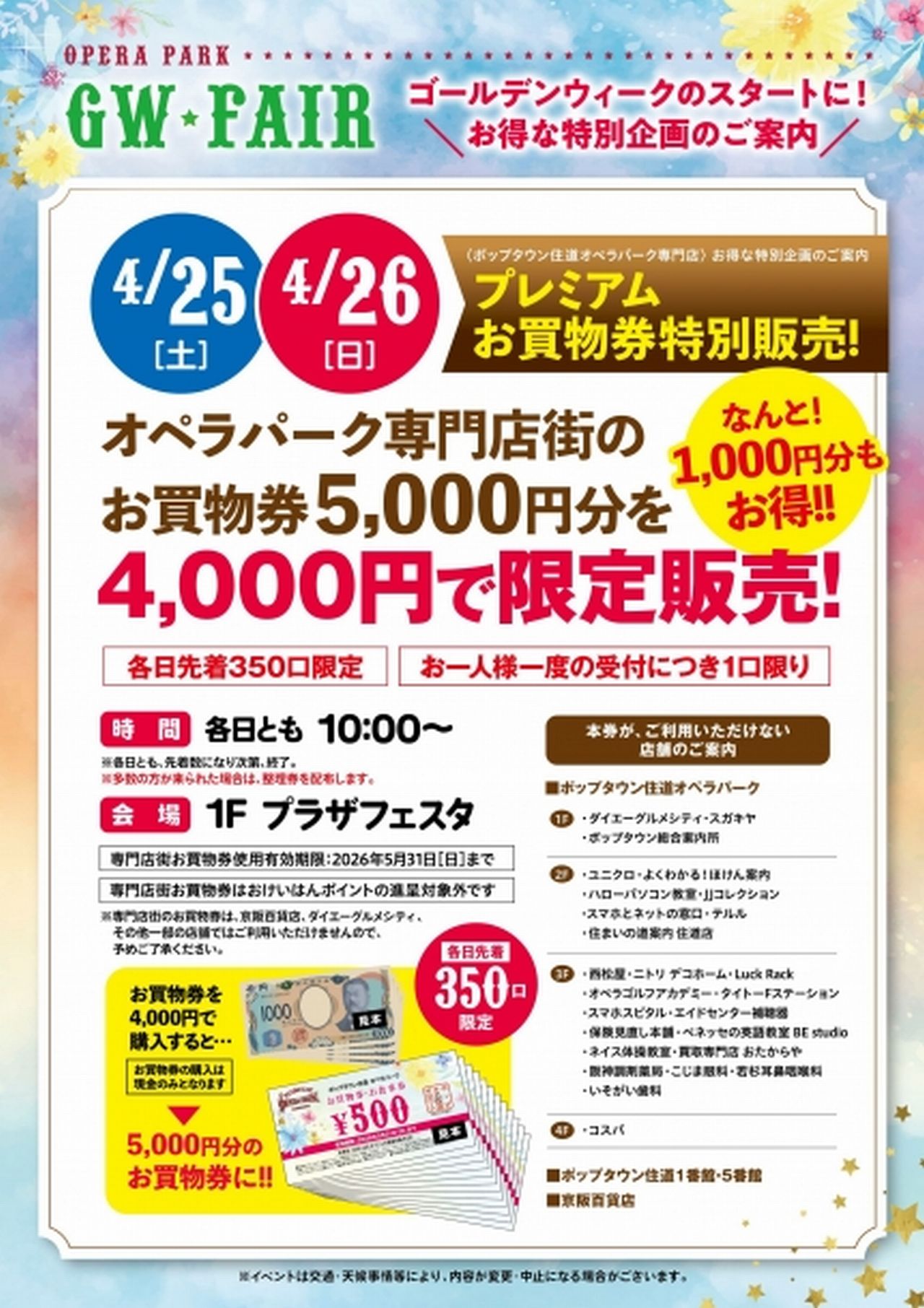 【大東市】ポップタウン住道オペラパークで「GOLDEN WEEK FAIR 特別企画」4000円が5000円になる!!