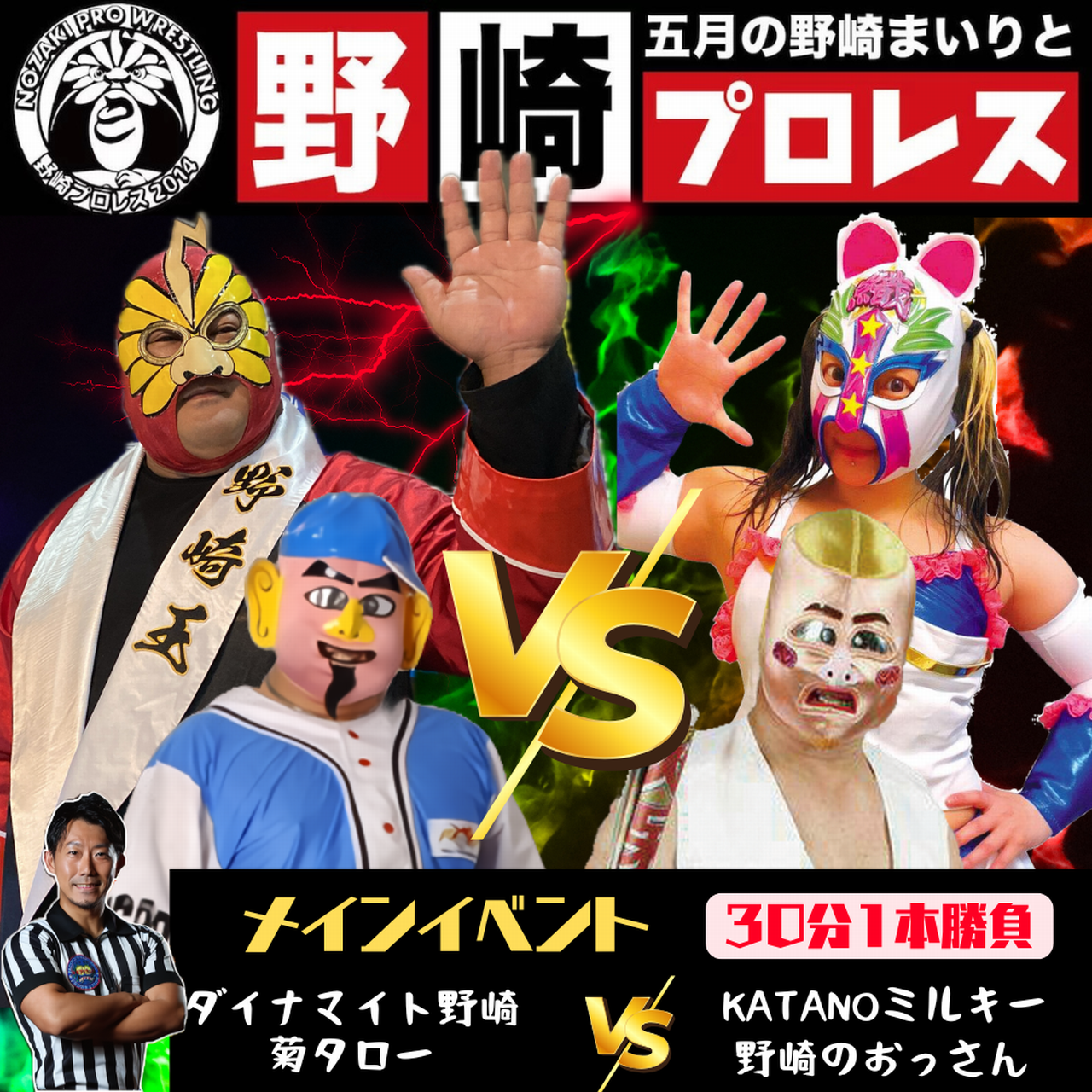 ◎ 第4試合(メインイベント):タッグマッチ 30分1本勝負 ダイナマイト野崎 & 菊タロー vs KATANOミルキー & 野崎のおっさん!