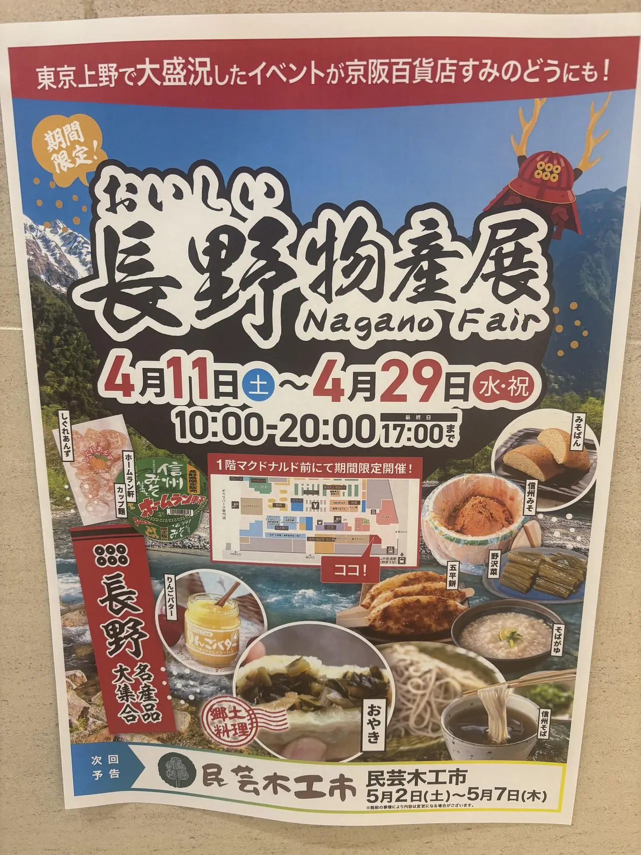 京阪住道一階の花屋さんがあった所で、4月11日から29日迄 長野物産展開催中です。