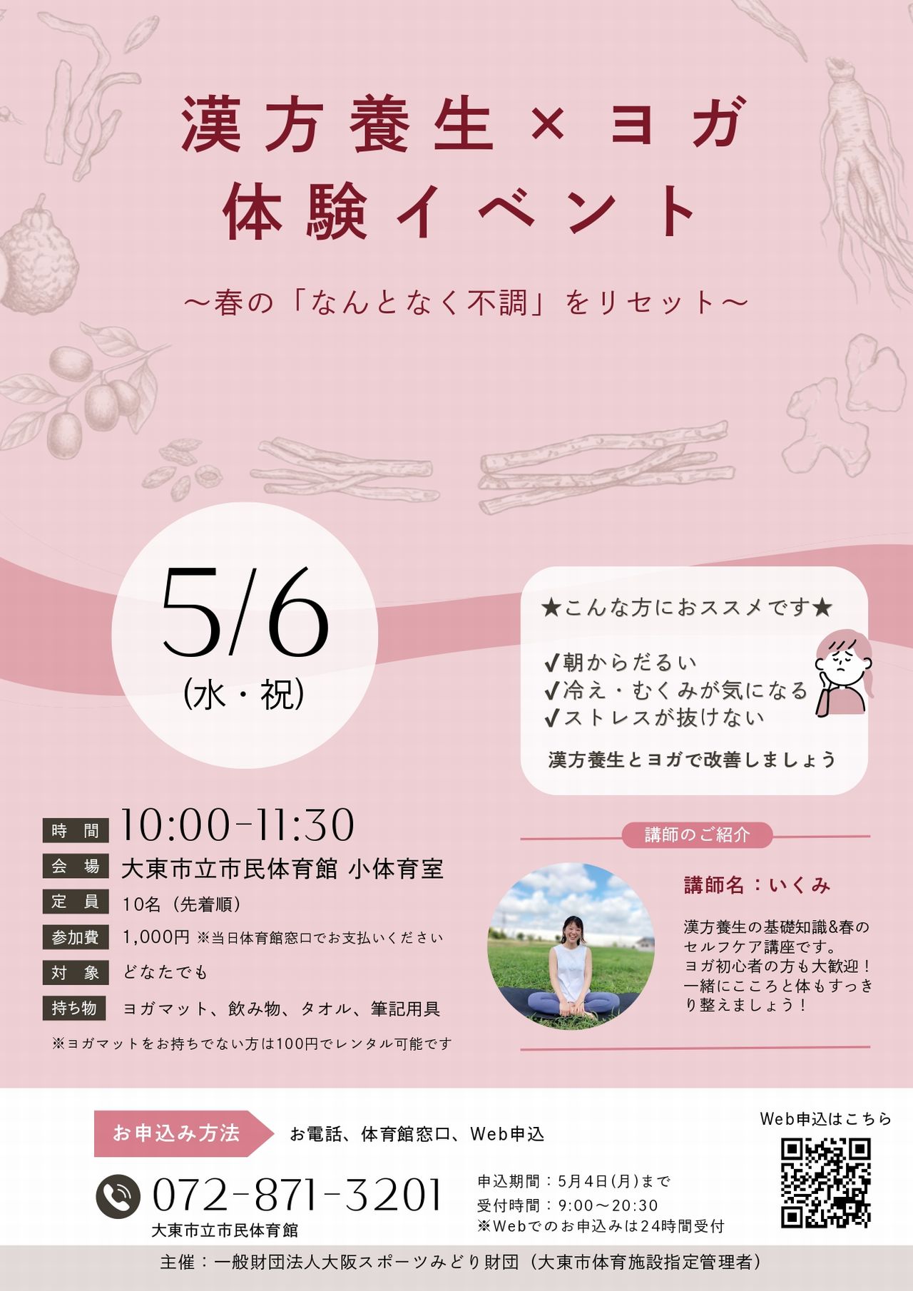 大東市立市民体育館では漢方養生とヨガを組み合わせた体験イベントを5月6日(水)の祝日に開催します。